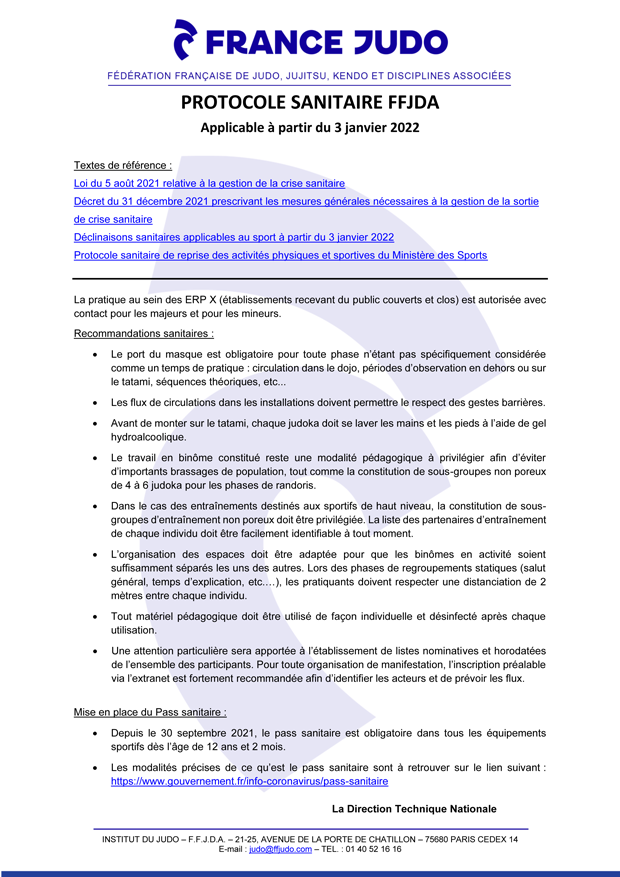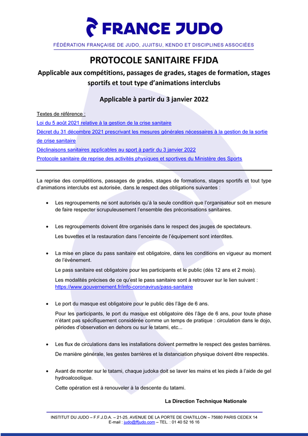 Protocoles sanitaires FRANCE JUDO 10/01/202204/01/2022 Retrouvez ci-après les protocoles sanitaires France Judo concernant l’activité en club et les compétitions (cliquez sur les images pour obtenir la version PDF des documents).