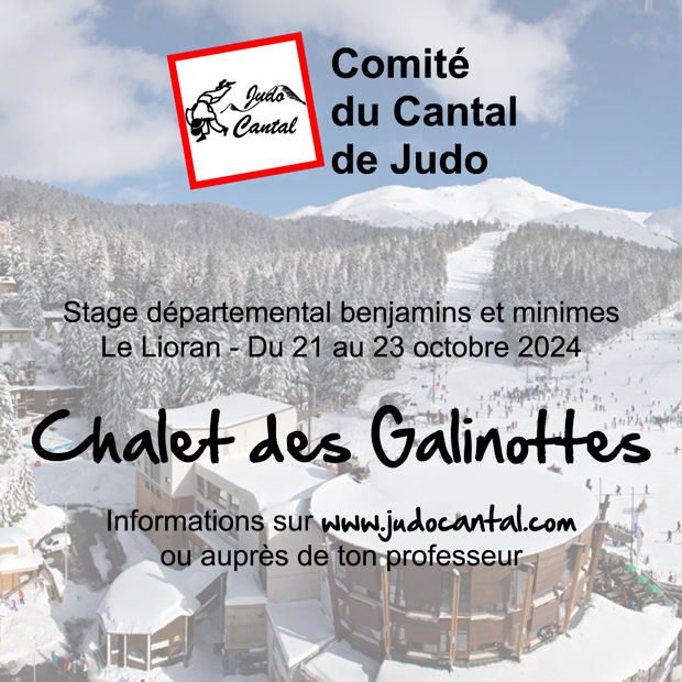 Le traditionnel stage départemental benjamins et minimes, organisé par le Comité du Cantal de Judo, se déroulera du 21 au 23 octobre 2024 et aura lieu au Lioran (Chalet des Galinottes).