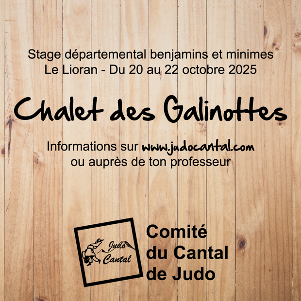 Le traditionnel stage départemental benjamins et minimes, organisé par le Comité du Cantal de Judo, se déroulera du 20 au 22 octobre 2025 et aura lieu au Lioran (Chalet des Galinottes).
